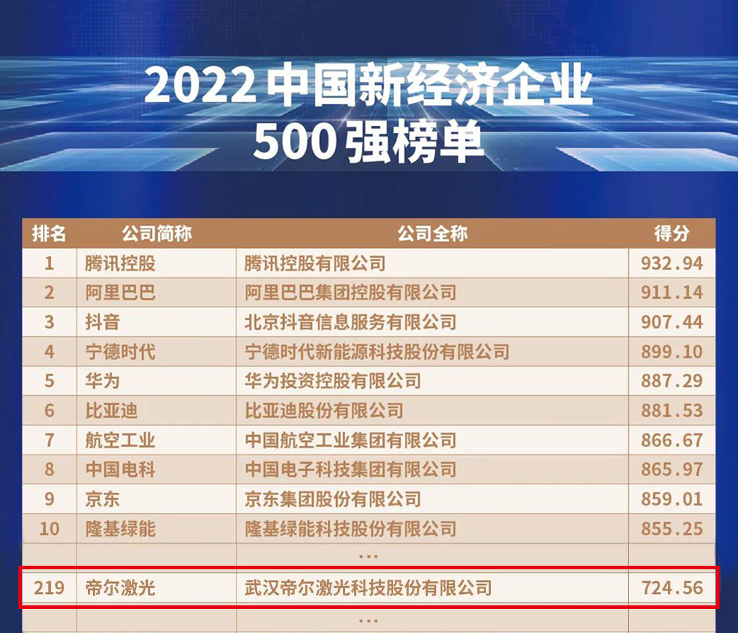 近日,以“加快建設(shè)世界一流企業(yè)”為主題的2022中國新經(jīng)濟(jì)企業(yè)500強(qiáng)發(fā)布會(huì)在北京舉行。在中國企業(yè)評(píng)價(jià)協(xié)會(huì)發(fā)布的“2022中國新經(jīng)濟(jì)企業(yè)500強(qiáng)”榜單中,帝爾激光位列第219位,相較去年的第389位,排名提升了170位。