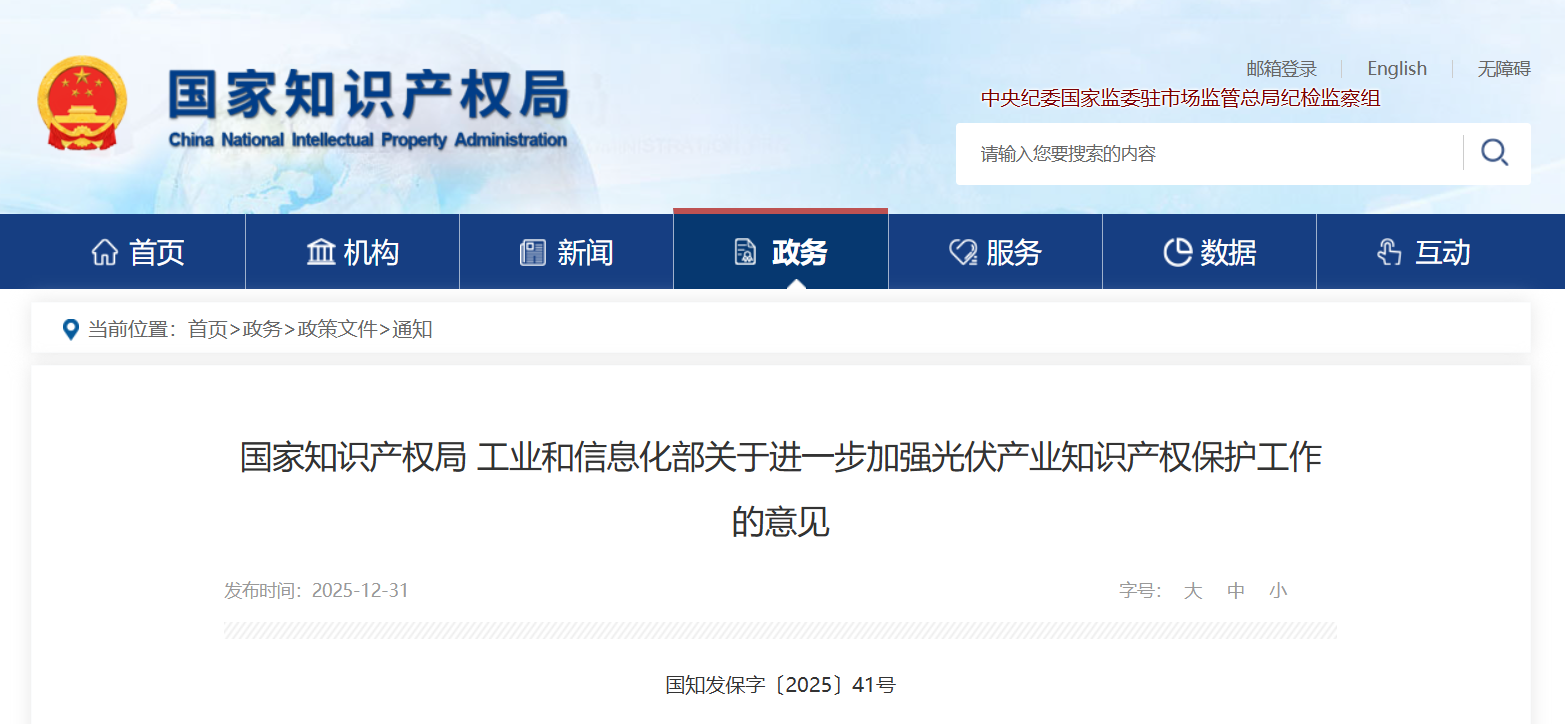 知識產權保護問題是光伏行業“內卷式”競爭的核心癥結之一。2025年12月31日,國家知識產權局、工業和信息化部聯合發布《關于進一步加強光伏產業知識產權保護工作的意見》,要求充分發揮知識產權保護和激勵創新的價值功能,有效破解“內卷式”競爭,持續營造公平有序的市場環境,促進光伏產業健康發展。其中特別強調,要加強知識產權協同保護,“依法禁止侵犯知識產權的光伏產品進出口”;強化招投標中的侵權規制,“中央企業和國有企業要發揮好模范帶頭作用,堅決杜絕制售、使用侵犯知識產權商品的行為,鼓勵在招標文件中明確要求投標企業自主承諾相關產品不存在知識產權違法侵權情形”。